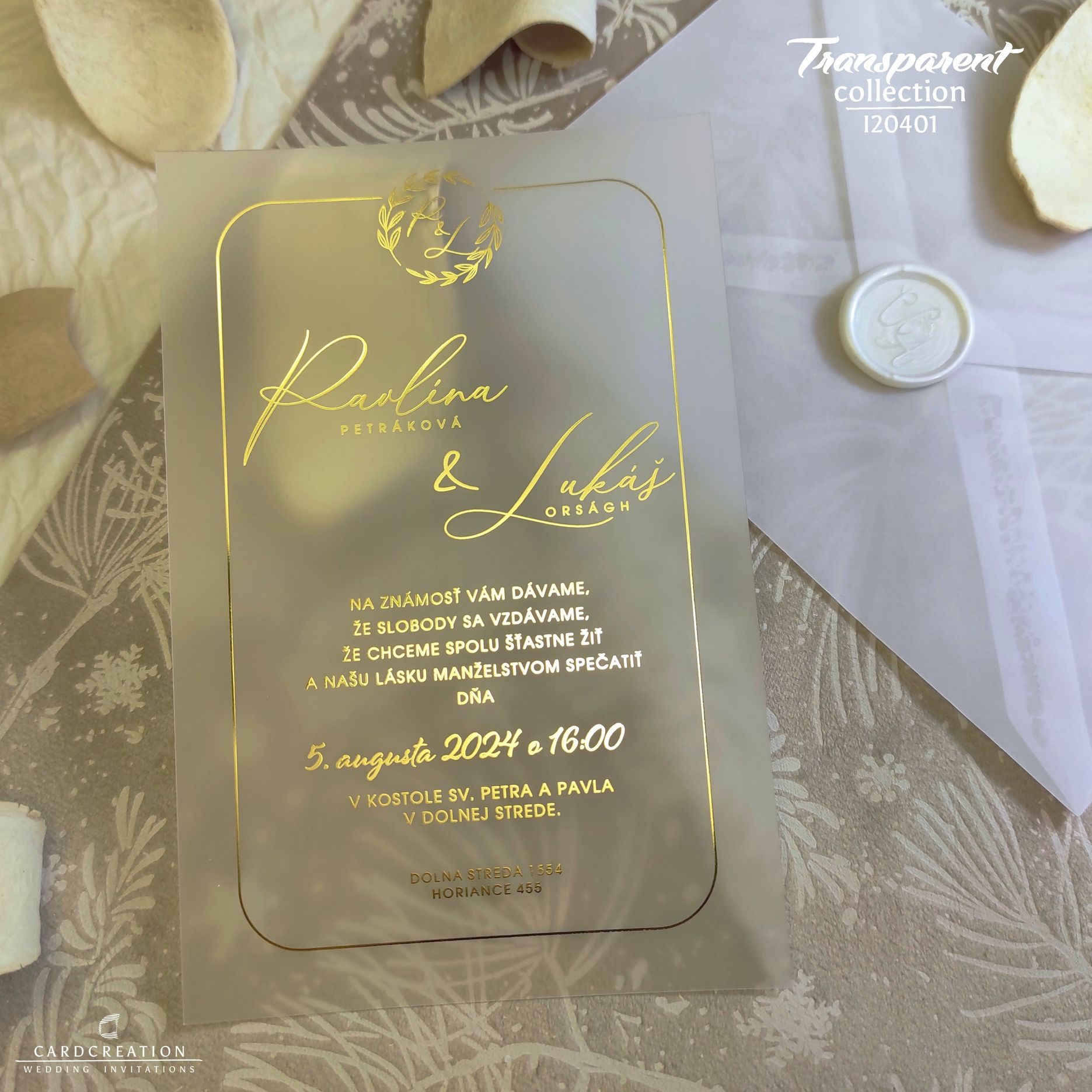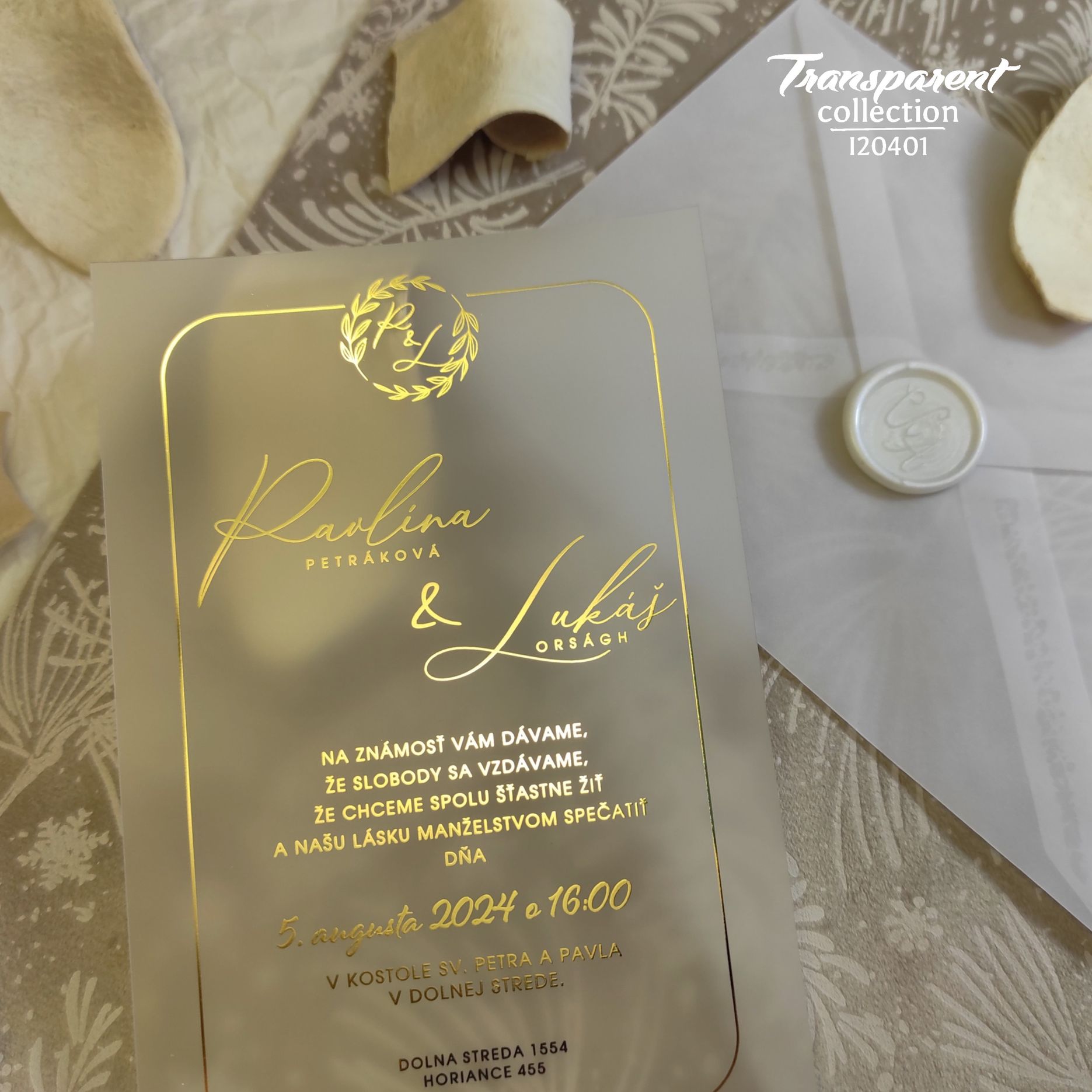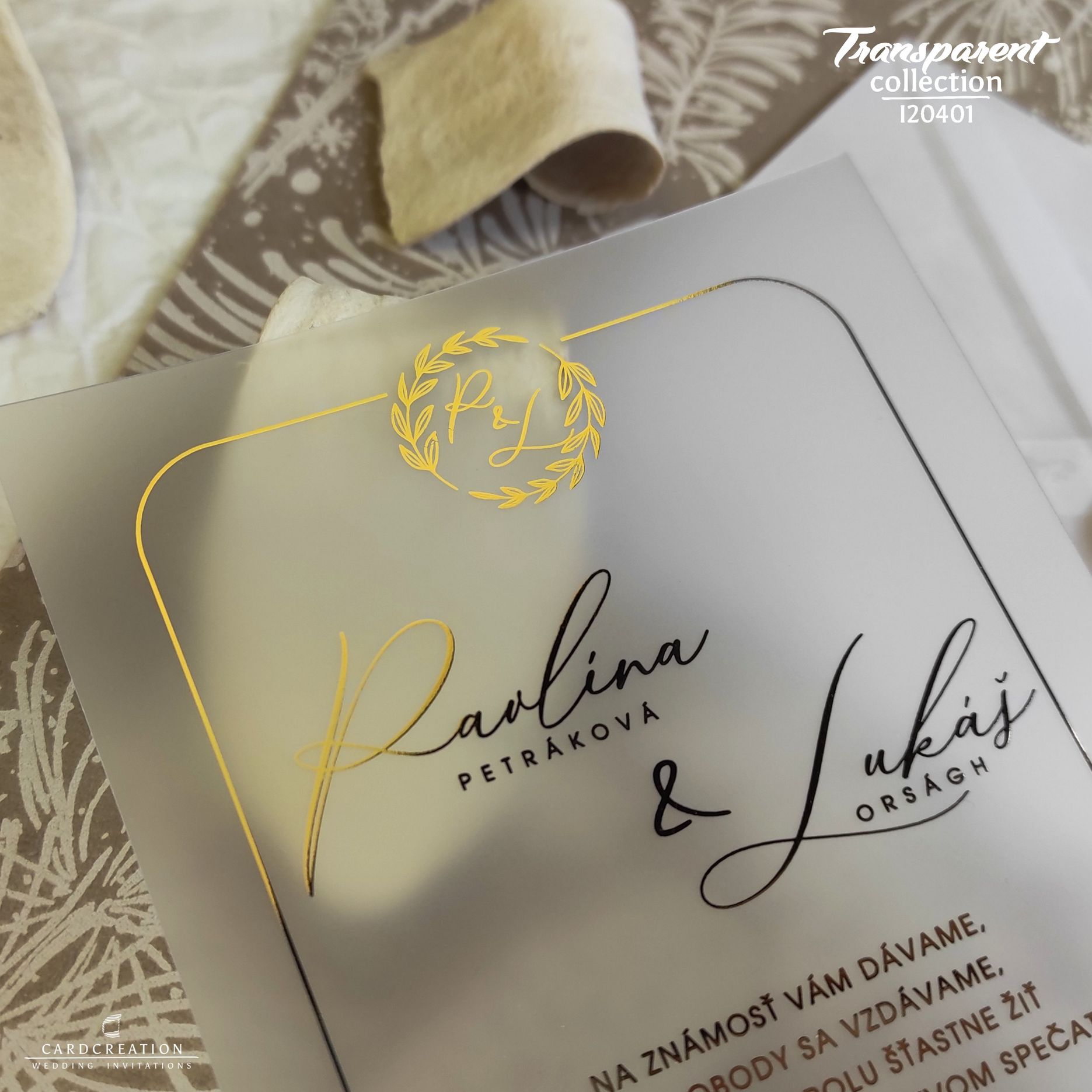 Moderné svadobné oznámenie tlačené na trendy transparentnej mliečnej fólii s nádychom elegancie vďaka využitiu zlatej termoražby.